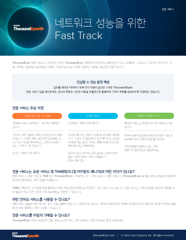 ThousandEyes 서비스로 디지털 경험 목표를 가속화하고 달성하세요. ThousandEyes에서는 플랫폼 활용을 극대화하고 원활한 운영을 보장하는 데 도움이 되는 다양한 오퍼를 제공합니다. ThousandEyes 서비스에는 연중무휴 24시간 표준 지원, 전담 테크니컬 어카운트 매니저 및 전문 서비스가 포함되어 있습니다.