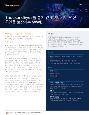 전 세계 시청자들에게 원활한 방송을 제공해야 하는 반복되는 당면 과제에 직면한 WWE는 ThousandEyes와 함께 강력한 어슈어런스 솔루션을 제공하기 위해 노력했습니다. 본사와 이동 중인 프로덕션 트럭에 전략적으로 Enterprise Agents를 구축하여 회복 탄력성과 광범위한 가시성을 지원했 습니다. 커스터마이징된 뷰와 대시보드를 통해 WWE는 ISP 및 CDN(Content Delivery Network)과 같은 소유하고 있는 인프라와 소유하지 않는 인프라에 모두 주의를 기울여 팬들이 좋아하는 액션으로 가득 찬 방송이 중단되기 전에 잠재적인 문제를 찾아낼 수 있었습니다.
