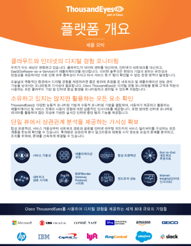 ThousandEyes는 모든 네트워크 및 서비스에서 디지털 경험을 End-to-End 방식으로 보장하는 데 필요한 가시성과 인사이트, 그리고 제어 기능을 제공합니다.
