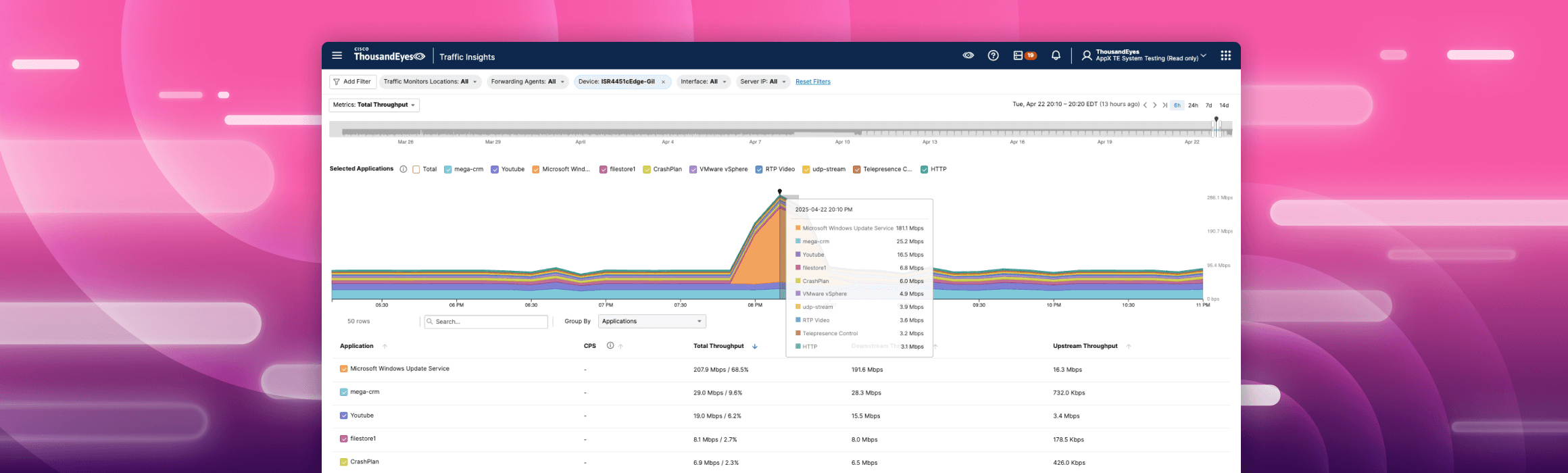 Broad Integration: Traffic Insights seamlessly integrates with ThousandEyes Enterprise Agents, including those running on Cisco networking devices using the Cisco Application Framework (CAF), and ThousandEyes Virtual Appliance (TEVA).