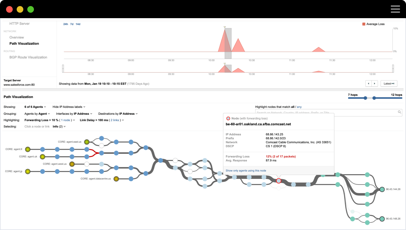 O Cisco ThousandEyes representa o mais alto padrão em termos de visualização do caminho de rede: uma visão unificada e correlacionada com o tempo de todos os caminhos entre dois pontos na rede global. Com visibilidade nas camadas de rede, aplicação, roteamento e dispositivo, sua empresa pode identificar rapidamente em que ponto da pilha de TI está ocorrendo um problema ou se há um problema de desempenho afetando a experiência do usuário final. Nossa solução de monitoramento fornece painéis e notificações fáceis de ler que ajudam as equipes de TI a identificar rapidamente a causa dos tempos de resposta lentos em aplicações Web.