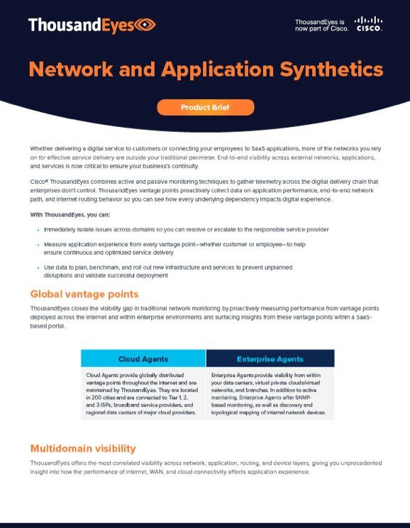 O ThousandEyes Network & Application Synthetics oferece visibilidade de ponta a ponta em todo o ecossistema digital, da WAN a todas as aplicações e usuários importantes no mundo conectado atual. Não apenas limitado pelo monitoramento de usuários reais, o teste sintético oferece conectividade contínua e em tempo real, latência e métricas de carregamento de página para ajudar a garantir que os contratos de nível de serviço (SLAs) sejam cumpridos.
