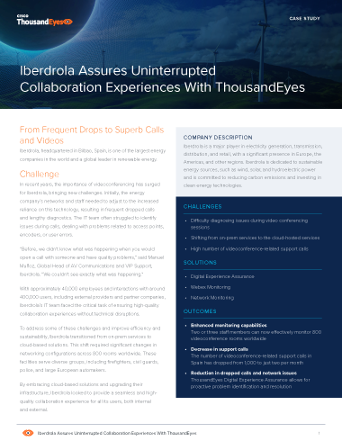 By assuring the digital experience, ThousandEyes provides Iberdrola users with confidence that their videoconferencing devices will function correctly, enabling productive interactions among colleagues and clients.