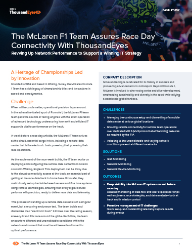For the McLaren F1 team, milliseconds make the difference between the podium and finishing last. The McLaren IT team recognizes their technology must operate with the same level of precision. To prevent IT issues that can impair operations during critical periods like Grand Prix events, they implemented ThousandEyes, specifically Enterprise Agents within its data center connecting back to mission control, prior to the Montreal Grand Prix 2023. This move proactively tuned its network for optimal performance. The setup process was fast and efficient, taking only a couple of hours, and the results were immediate.