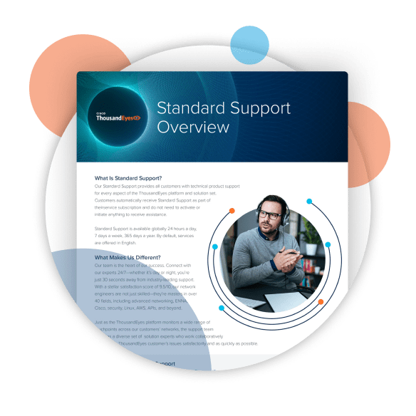 ThousandEyes is committed to supporting you at every stage. We offer a range of services to help you fully leverage our platform and maintain seamless operations. With your ThousandEyes platform subscription, you receive Standard Support, which includes round-the-clock customer assistance, available 24/7/365. For an extra level of service, our Technical Account Managers (TAMs) provide dedicated support during business hours to ensure smooth operations. Complementing this, our Professional Services team is on hand for custom project implementations and integrations, maximizing your return on investment, and helping to ensure successful product adoption—accelerating time to value.