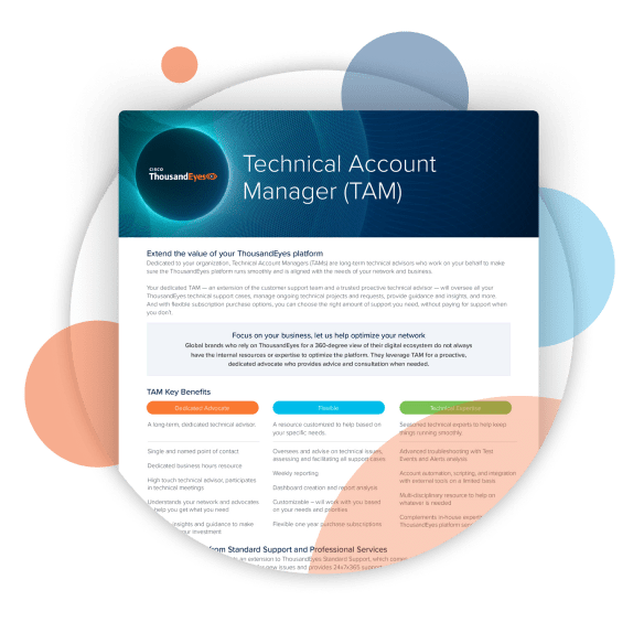 ThousandEyes’ Technical Account Managers (TAMs) provide proactive, dedicated support and technical guidance.