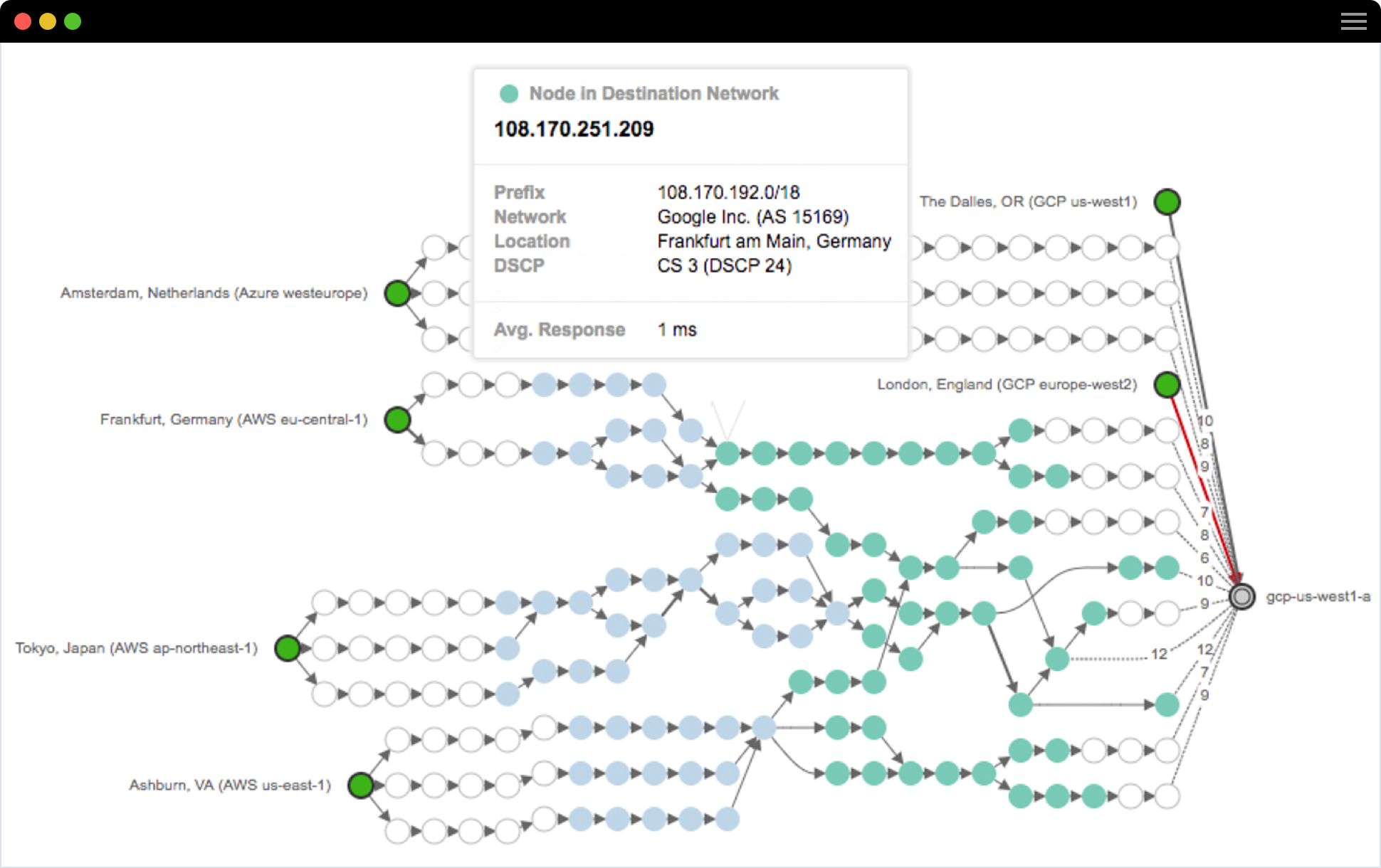 - ThousandEyes path visualization shows the hop-by-hop network path and health between test agents and Google Cloud Services, helping you isolate issues related to loss, latency, and network routing in order to rapidly determine if it’s being caused by the application service or the network.