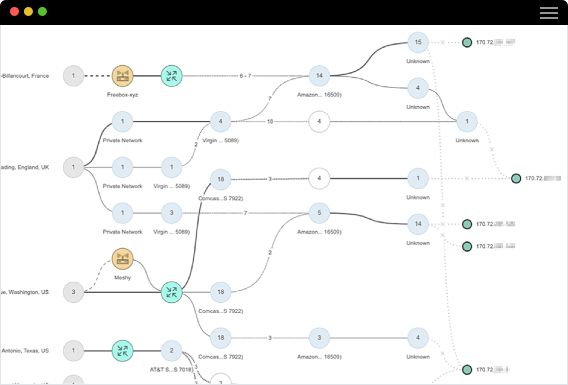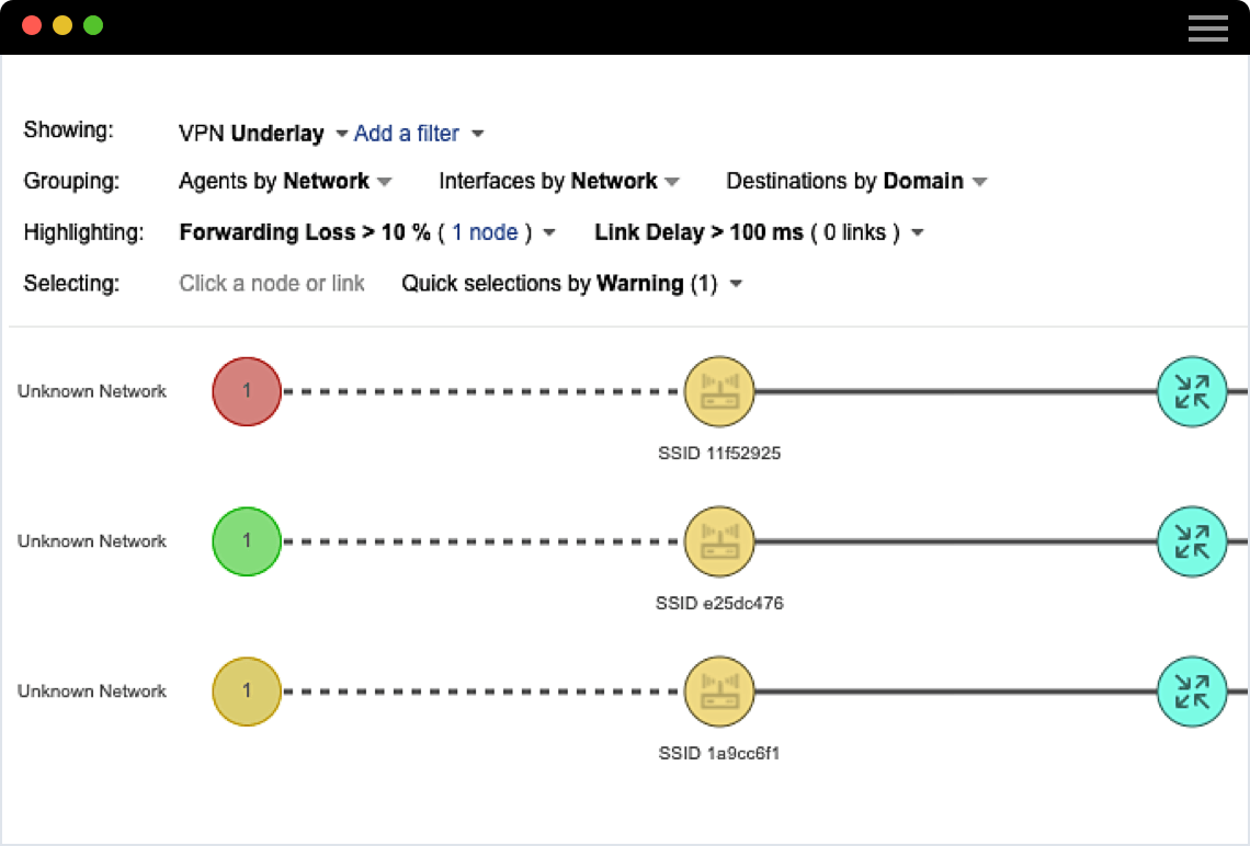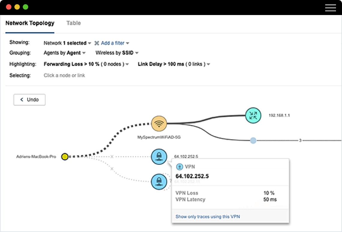 - Visualize network paths to easily diagnose a sub-optimal VPN gateway or split tunnel configuration issue that may be resulting in poor end user experience