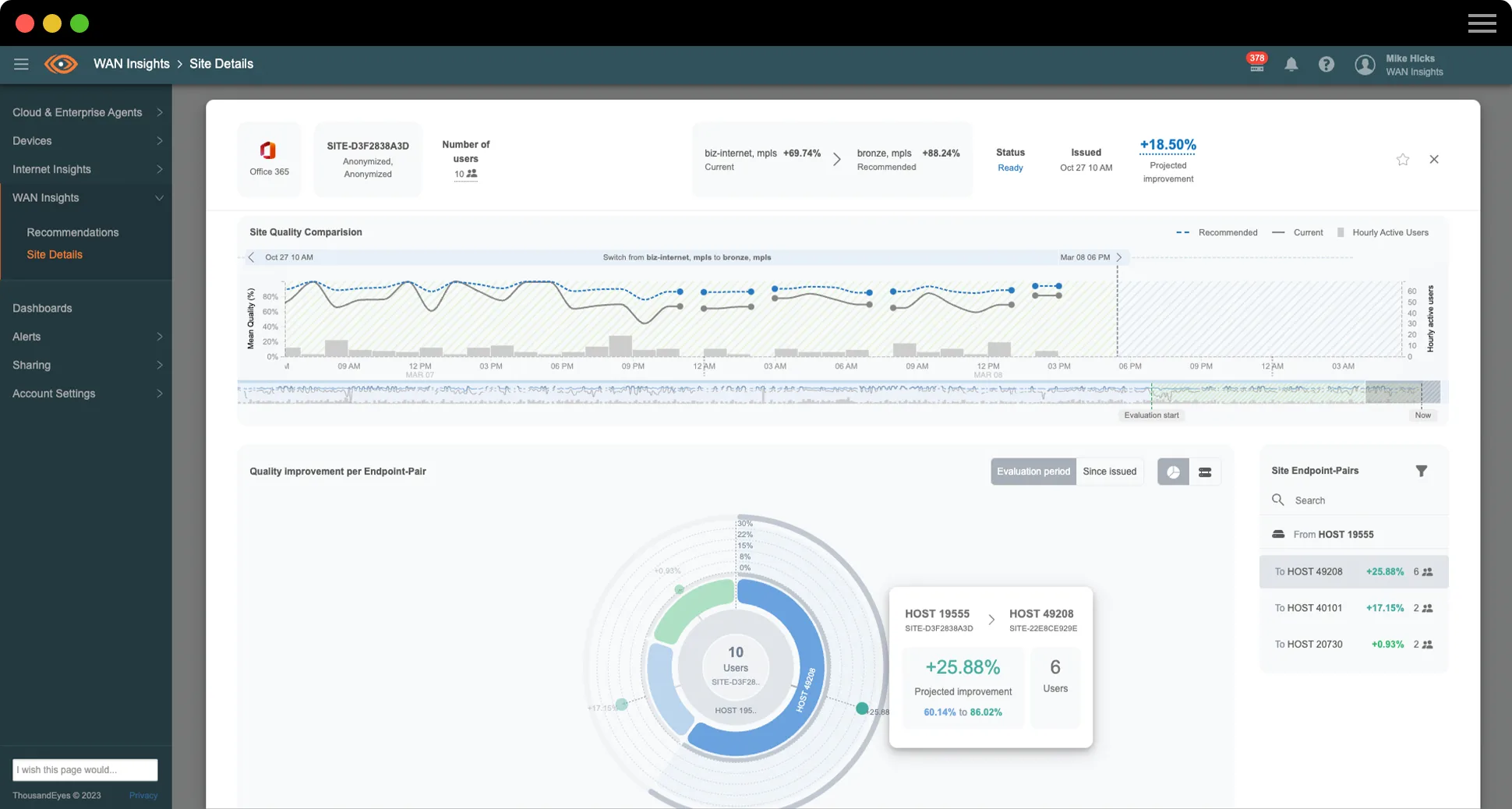 ThousandEyes WAN Insights 可对底层和重叠网络数据持续进行实时分析,在此基础上提出首选策略建议,防止特定站点的应用出现影响体验的问题。这些长期建议与各个站点和应用类别密切相关,而且质量估测可反映建议路径相比当前路径的预测质量改进。
