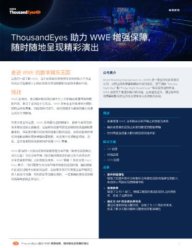 借助 ThousandEyes,WWE 能够及早发现网络异常,大幅缩短平均修复时间 (MTTR),减轻互联网中断的影响。ThousandEyes 平台不仅缩短了 MTTR,还提升了可视性和协作效率,这进一步增强了 WWE 的网络基础设施,确保全球观众能够流畅观看节目。